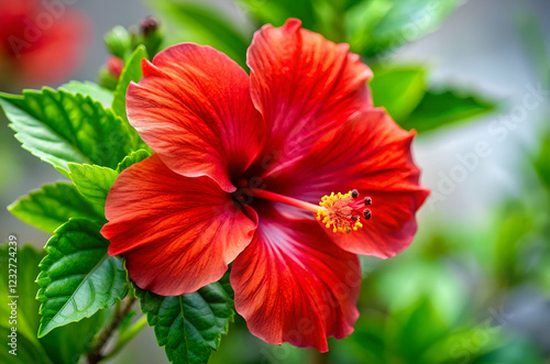A vibrant red hibiscus flower surrounded by lush green leaves, showcasing its delicate petals and bright yellow stamen.