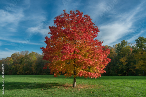 maple, red maple, autumn, fall, tree, leaf, crimson, orange, canopy, greenfield, grass, blue skies, cloud, nature, photorealistic, seasonal, landscape, serene, bright light, shadow, contrast, foliage, environment, peaceful, single tree, vibrant, natural, colourful, calm