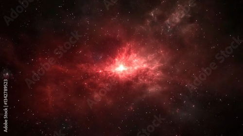 A vibrant red nebula captivates with its luminous glow, set against the vast backdrop of the star-filled universe, showcasing cosmic beauty