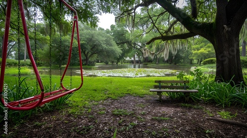 red, swing, set, park, lush, verdant, oak, tree, emerald, grass, play, recreation, children, playground, leisure, fun, vibrant, equipment, sturdy, public, space, nature, green, environment, joyful, anchored, safety, iron, chain, wood, beam, activity, refreshing, healthy, community, gathering, shade, wooden, childhood, swing, robust, relaxing, neighbourhood