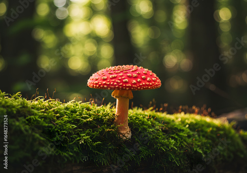 forest, mushroom, toadstool, red, fungal, white, spot, moss, green, nature, timberland, tree, plant, ecology, biology, mycology, stem, cap, spore, gill, autumn, summer, sunlight, light, bokeh, background, outdoors, environment, organic, vibrant, colours, detail, macro, closeup, texture, growth, wild, natural, earthy, damp, wood, log, leaf, tree branch, ground, scene, landscape, flora