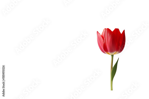A vibrant red tulip on a white isolated background, showcasing its delicate petals and green stem in full bloom.