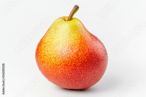 fruit, pear, food, healthy, ripe, fresh, juicy, delicious, produce, snack, diet, nourishment, single, object, isolated, white, background, stem, skin, texture, colours, red, yellow, green, gradation, organic, nature, closeup, detail, macro, seed, surface, sweet, agriculture, botanical, epicure, whole, edible, raw, natural, studio, vibrant, speckled, dew, droplet, smooth, dessert