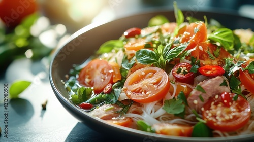 A vibrant salad bowl filled with fresh ingredients like tomatoes, herbs, and spices, radiating colors and textures that celebrate the essence of healthy eating.