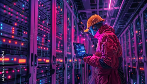 A vibrant scene in a server room with rows of cables and LED lights, an engineer checking data on a laptop