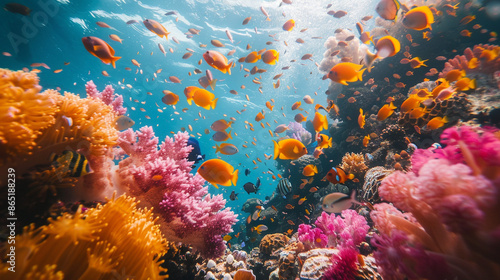 A vibrant scene of the colorful coral and diverse marine life at Toyapakeh Wall, a popular dive site in Nusa Penida.