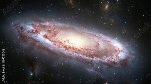 A vibrant spiral galaxy, showcasing its bright core, swirling arms, and scattered star clusters against a dark, star-studded backdrop