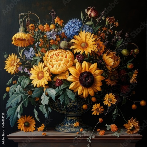 sunflower, peony, blossom, vase, decorative, dark, background, still, life, vibrant, yellow, orange, blue, purple, red, green, leaf, flower petals, flower, art, painting, realistic, detailed, intricate, gorgeous, beautiful, summer, autumn, nature, botany, floral, arrangement, composition, colours, contrast, light, shadow, texture, depth, rich, opulent, elegant, dramatic, majestic, bold, intense, mellow, warm, cool
