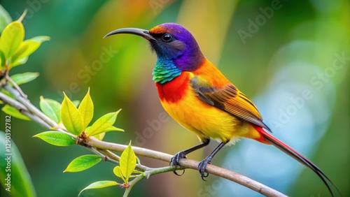 A vibrant sunbird with bright orange and yellow plumage perched on a thin tree branch, its long tail feathers spread wide in balance , sunbird, tropical