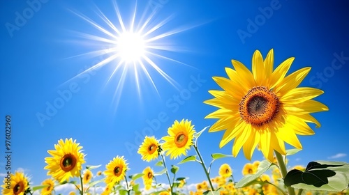 A vibrant sunflower field under a clear blue sky, showcasing the beauty of nature and bright sunlight.