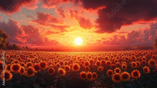 A vibrant sunset casts a warm glow over a vast field of sunflowers, their golden faces turned towards the sky.