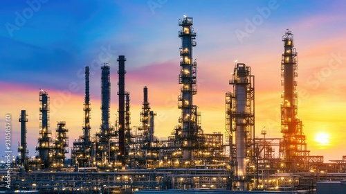 A vibrant sunset over a bustling oil refinery, showcasing towering structures and glowing lights, symbolizing industrial progress.