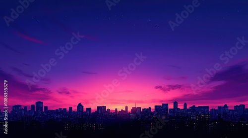 A vibrant sunset over a city skyline, blending purple and pink hues.