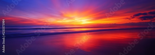 A vibrant sunset over a quiet beach, with the sky reflecting rich hues of orange and purple