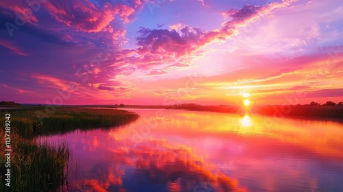 A vibrant sunset over a tranquil lake, with the sky painted in shades of pink, orange, and purple