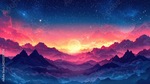 sunset, mountain, cloud, sky, star, landscape, nature, scenery, colours, horizon, twilight, evening, beauty, peaceful, tranquil, atmospheric, gradient, silhouette, panoramic, vibrant, artistic, digital, fantasy, serene, view, warm, cool, light, shadow, adventure, exploration, calm, breathtaking, visual, art, inspiration, dreamlike, picturesque, captivating, majestic, remote, wild, elevation, depth, calmness, wonder, ambience