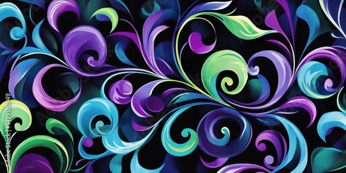 abstract, floral, swirl, pattern, design, vibrant, colours, purple, blue, green, black, background, texture, decorative, seamless, ornamental, art, graphic, modern, dynamic, flowing, curvilinear, intricate, artistic, bold, colourful, whimsical, stylish, background, swirly, fabric, textile, print, foliage, leaf, trendy