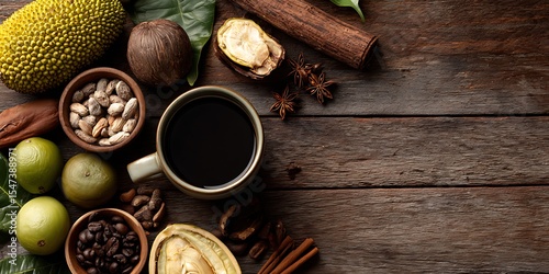 A vibrant tabletop display with various fruits, seeds, beans, spices, leaves and a cup of dark coffee