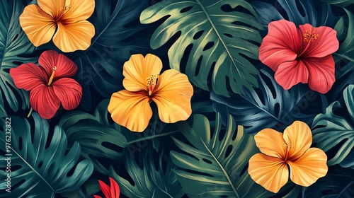 A vibrant tropical floral design featuring red and yellow hibiscus flowers and lush green leaves.