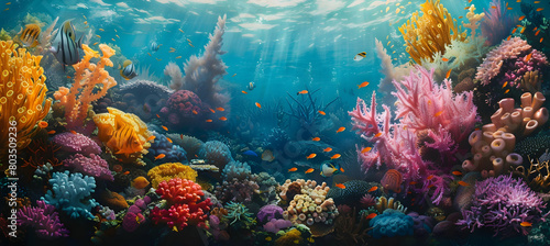 A vibrant underwater scene along a continental shelf, capturing the dynamic range of colors in coral ecosystems with fish swimming in the foreground