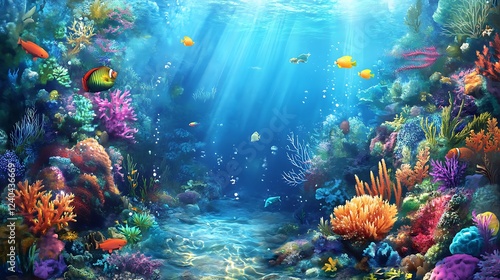 A vibrant underwater scene with colorful coral reefs, fish, and sunbeams