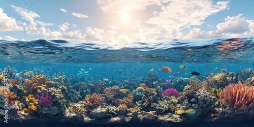 water, ocean, sea, reef, coral, fish, marin, underwater, blue, sky, sunlight, cloud, colourful, life, aquatic, ecosystem, nature, vibrant, view, depth, beautiful, tropical, animal, fauna, surface, wave, bright, environment, beneath, clear, sunny, formation, bottom, diverse, light, paradise, composition, landscape, scene, earth, peace, calm, calmness, horizon, natural