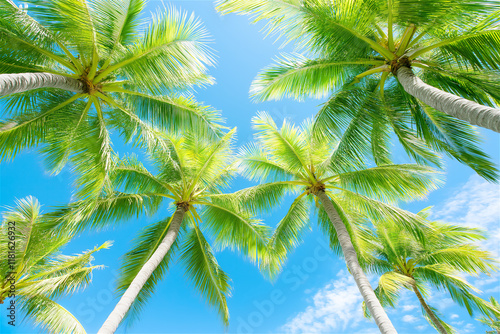 A vibrant upward view of tall tropical palm trees against a bright blue sky, capturing the essence of a warm, relaxing summer day. Ideal for travel themes.
