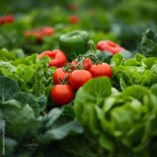 A vibrant vegetable field with a variety of ripe, fresh vegetables growing in a lush green landscape, shot close up.