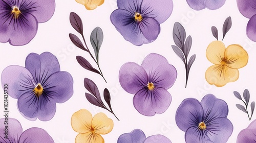 A vibrant, watercolor floral pattern featuring purple and yellow pansies, complemented by delicate leaves against a light background.