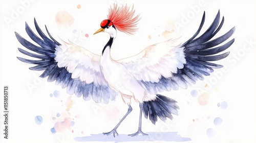 A vibrant watercolor illustration of a majestic crane with outstretched wings and colorful feathers, embodying grace and beauty.