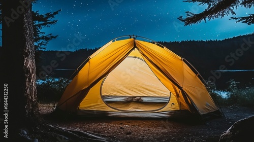 A vibrant yellow camping tent illuminated against a starry night sky by a serene lake and forest backdrop