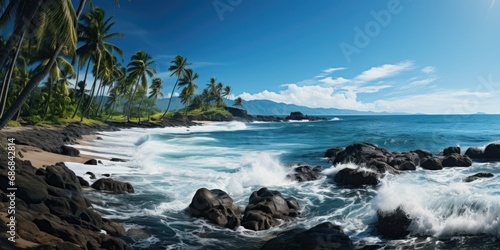 view, beach, palm, tree, wave, nature, blue, coastline, wave, landscape, summer, water, outdoors, tropical, climate, vacation, sand, travel, beauty, seascape, idylli, rock, object, cloud, sky, destination, surf, sun, sunset, tour tourism, tranquil, scene, tree, day, ai