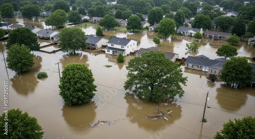 A view of a flooded residential area, with homes surrounded by water and trees partially submerged, showing the impact of heavy rains