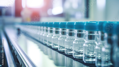 A view of a pharmaceutical production line at work, featuring medical vials and glass bottles, with pharmaceutical machines in operation.