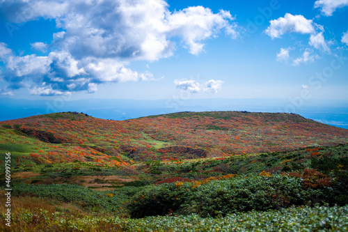 宮城県栗原市、秋田県湯沢市、雄勝郡東成瀬村、岩手県一関市にある栗駒山を紅葉の時期に登山する風景A view of climbing Mt. Kurikoma in Kurihara City, Miyagi Prefecture, Yuzawa City, Akita Prefecture, during the autumn foliage season.