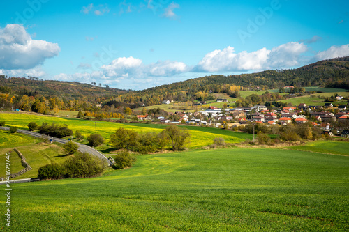 A view of the hill called Helfštýn on the field and the surrounding can be seen village Krhová during a sunny day with many colored clouds