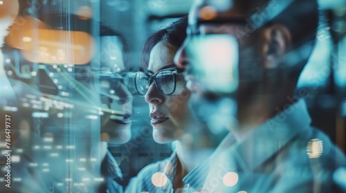 A view through glass of two confident businesspersons, a male and a female, collaborating on a project and sharing ideas.