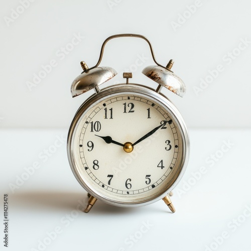 A vintage alarm clock featuring a classic design with a white face and metallic finish, ideal for conveying themes of time management, nostalgia, or daily routines in projects or marketing materials,
