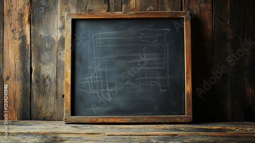 A vintage blackboard with white chalk markings, resting against a textured wooden wall.