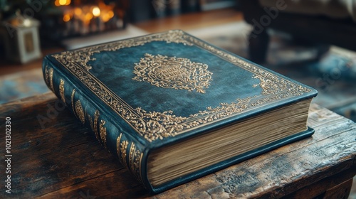 A vintage book with an ornate cover resting on a rustic table, exuding charm and historical significance in a cozy setting.