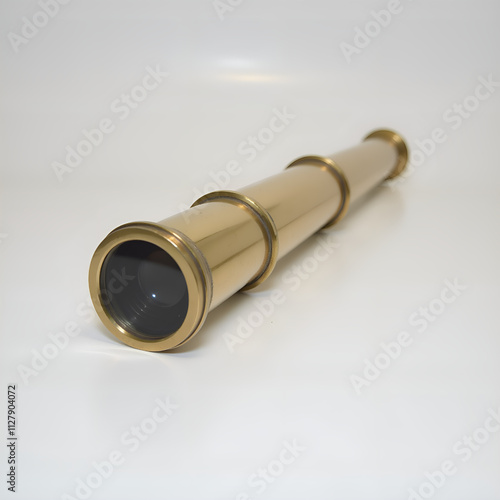A vintage brass telescope with a gleaming finish resting elegantly on a white surface, photography of still life concept.