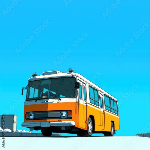 A vintage bus, orange and white, is depicted against a vibrant blue sky. The clean lines and minimalist style create a striking contrast. The setting appears to be a simple street scene