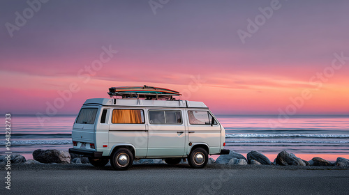 A vintage camper van parked by the beach at sunset, capturing serenity and adventure.