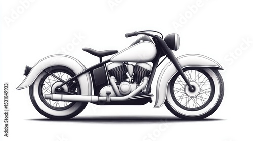 A vintage motorcycle is depicted in black and white, showcasing its classic design and detailing, emphasizing a timeless appeal.