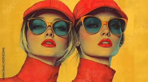 A vintage-style illustration of two women wearing summer hats and sunglasses, evoking a retro fashion aesthetic