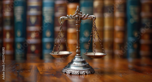 A vintage-style Lady Justice scale, symbolizing justice and equality, rests on a wooden table against a backdrop of leather-bound law books. Law and justice.