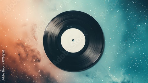 A vinyl record suspended in a cosmic setting, with a blank label for clear copy space. The background features swirling galaxies and twinkling stars, with soft, ambient lighting to enhance.