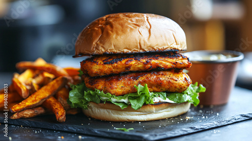 A visual of a spicy chicken sandwich with lettuce and mayo, served with a side of sweet potato fries.