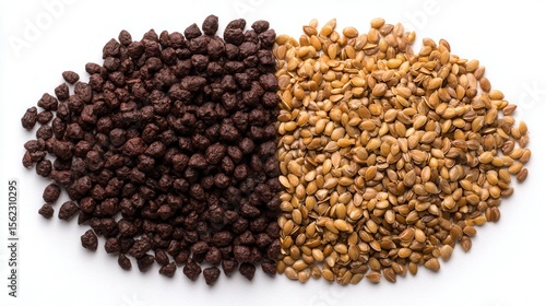 A visually appealing arrangement of dark brown and light tan seeds showcases the contrast between different seed types, Ideal for use in culinary, agricultural, or health-related content,