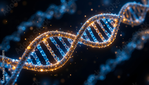 A visually striking render showcases a shimmering DNA double helix against a dark backdrop, representing science, medicine, and genetics.